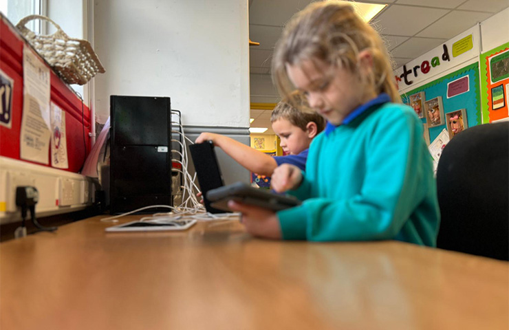 • PLant yn chwarae gyda iPads yn y dosbarth